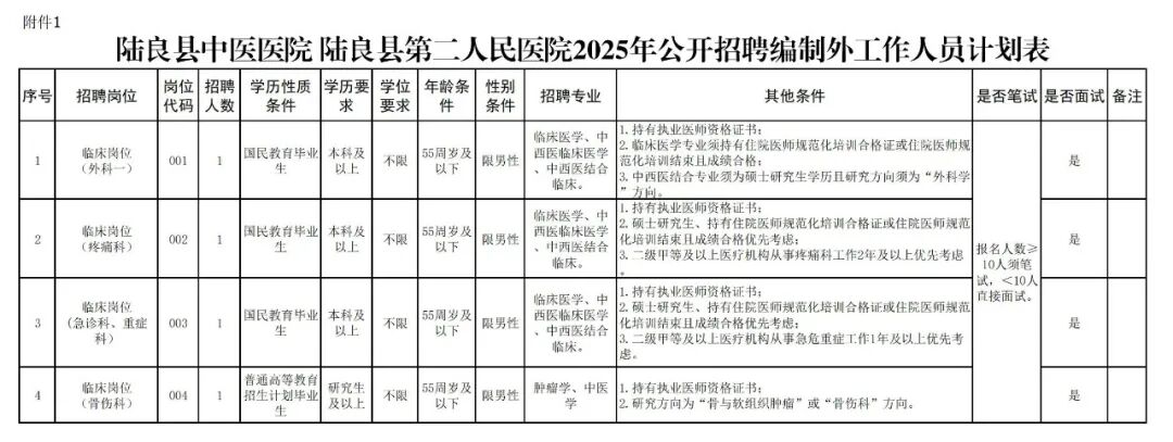 (二)招聘岗位和人数及资格条件详见附件1《陆良县中医医院 陆良县第二人民医院2025年公开招聘编制外工作人员计划表》(以下简称“计划表”)。