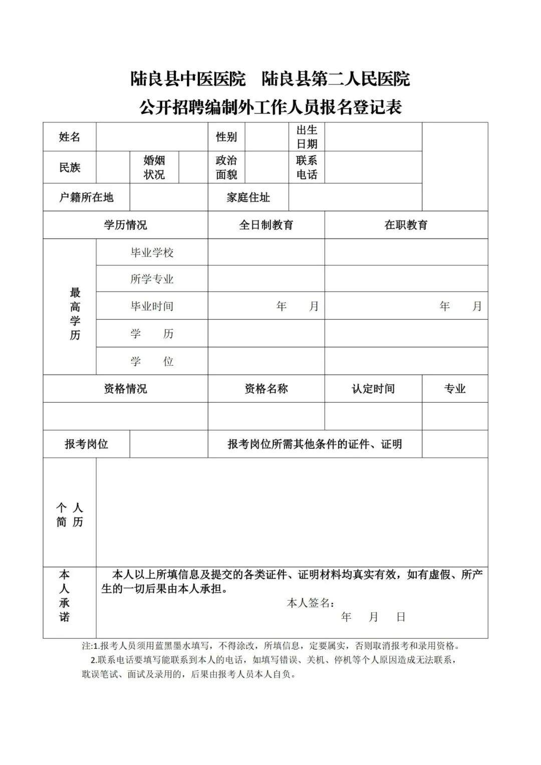 2.陆良县中医医院 陆良县第二人民医院公开招聘编外工作人员报名表。