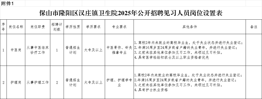 附件1.隆阳区汉庄镇卫生院2025年公开招聘见习人员岗位设置表.xlsx