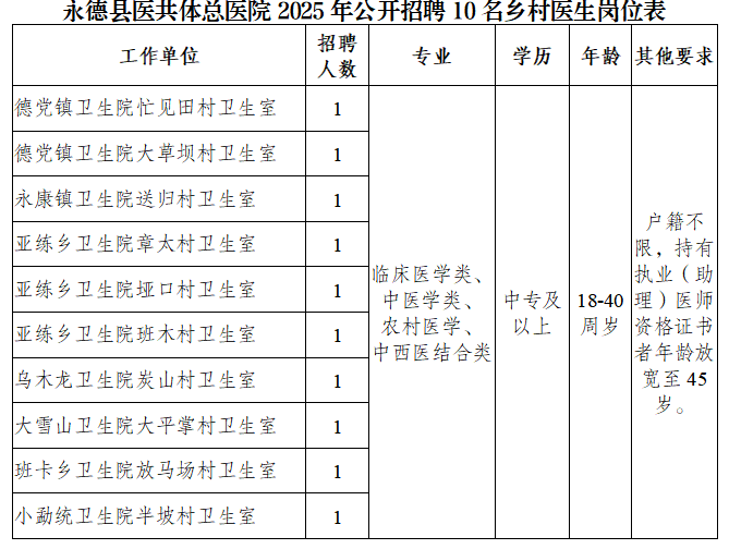 (四)符合《永德县医共体总医院2025年公开招聘10名乡村医生岗位表》具体要求。